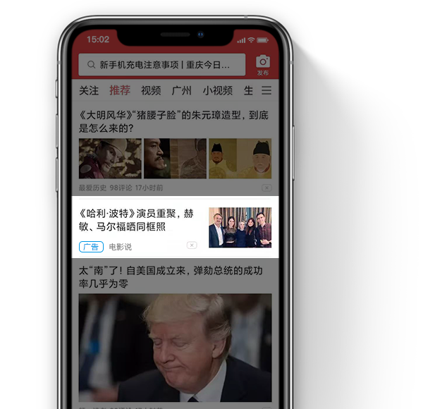 资讯流中穿插展现的原生广告形式,广告即是内容,契合资讯深度阅读体验的广告形式支持CPM、CPT、GD、CPC等多种售卖方式。